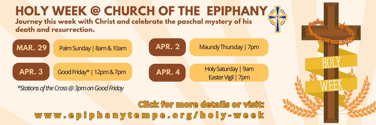 Also known as the Sunday of the Passion, Palm Sunday is the first day of Holy Week. We commemorate Jesus’ journey into Jerusalem with the Blessing of the Palms and the reading of the Passion Gospel.